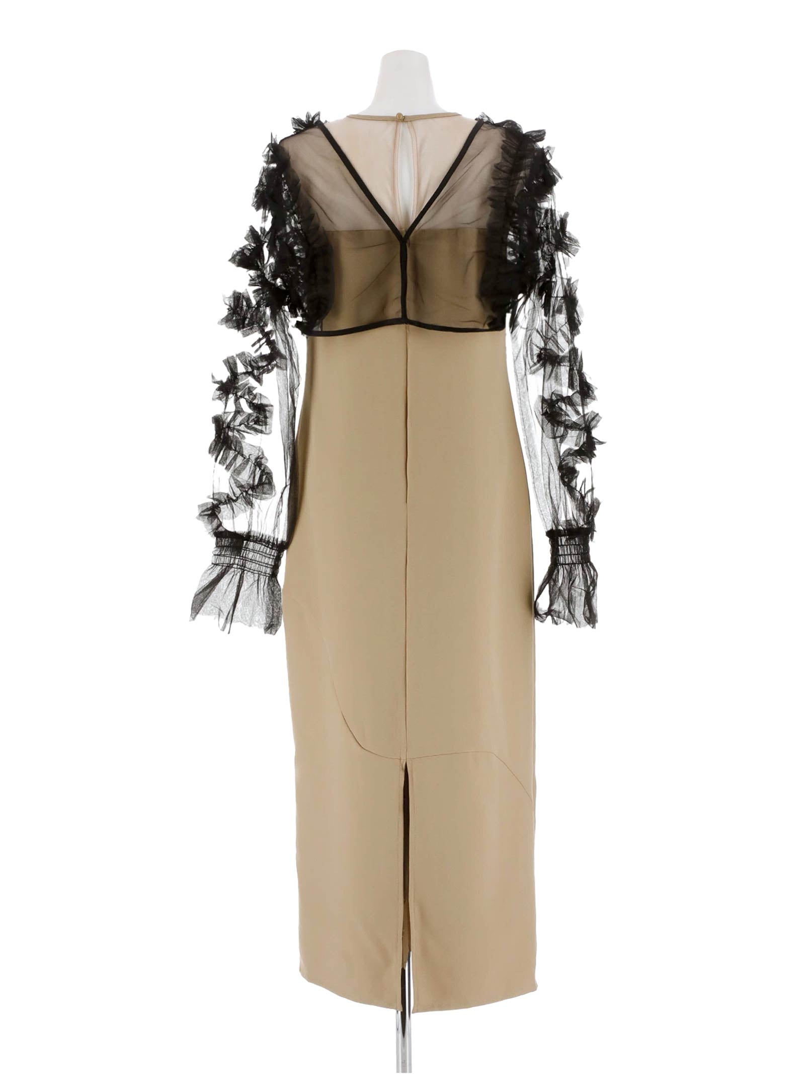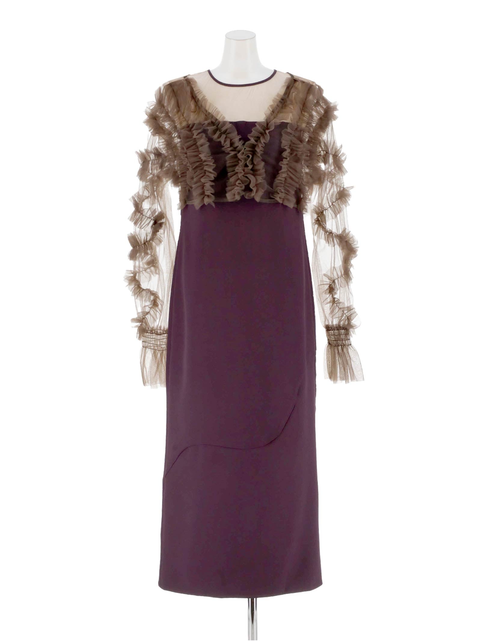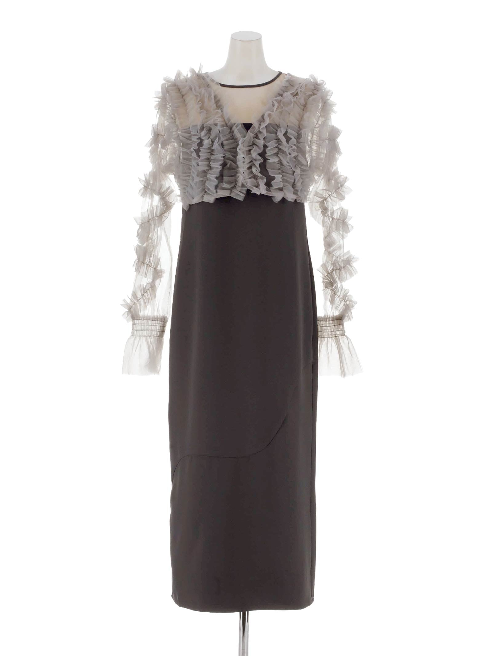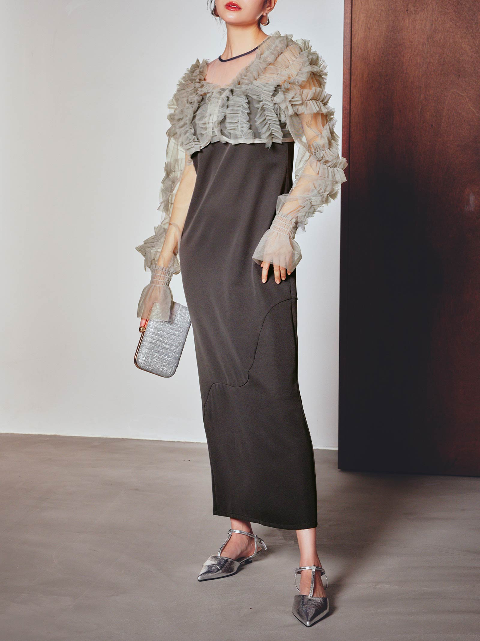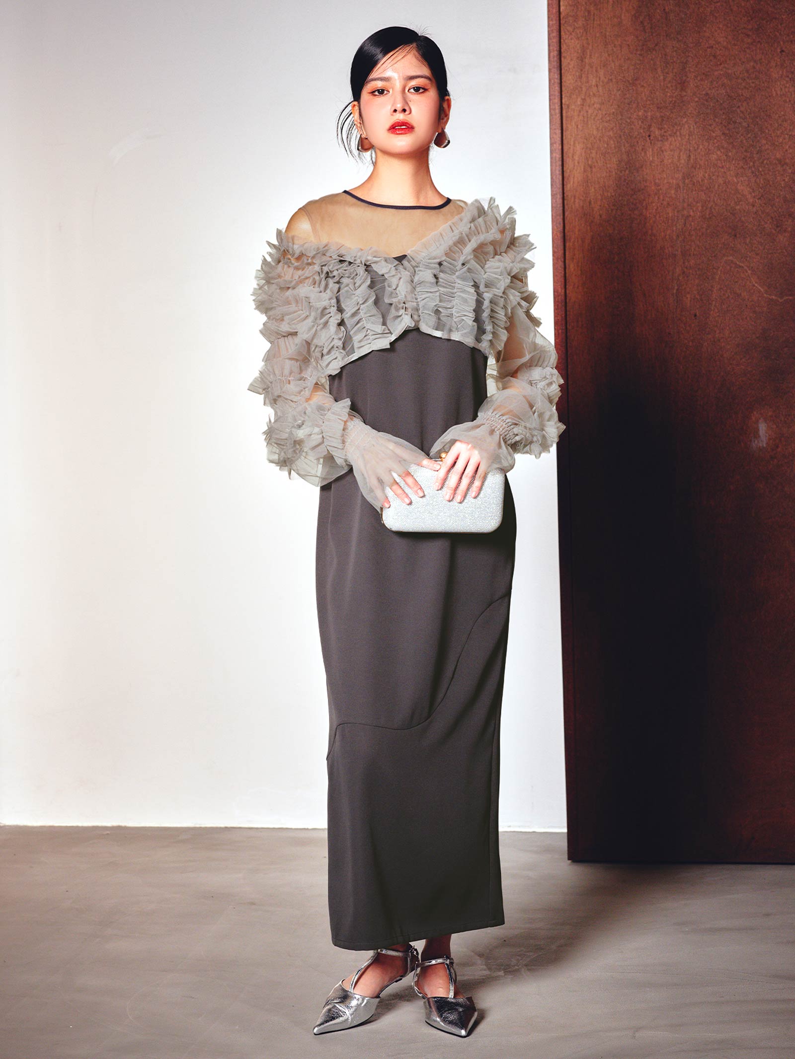 トレンドのチュールフリルが上半身を華やかに見せ、素材感やディテールの妙でつくる計算ずくのドレススタイルを更新。