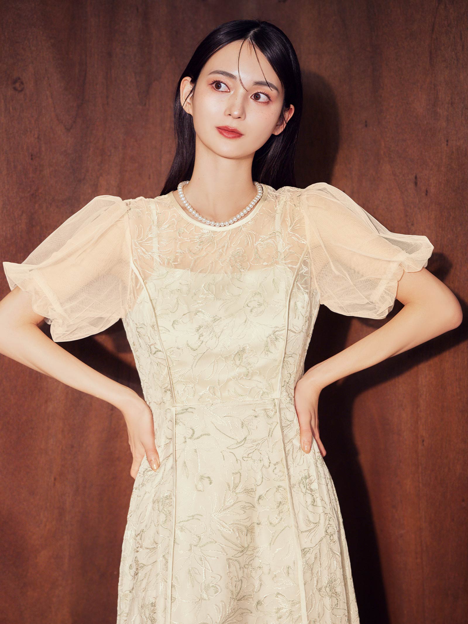 ウエストを引き締めつつ広がる絶妙なAラインシルエット&チュール素材のボリューム感あるパフスリーブが上品な印象です。