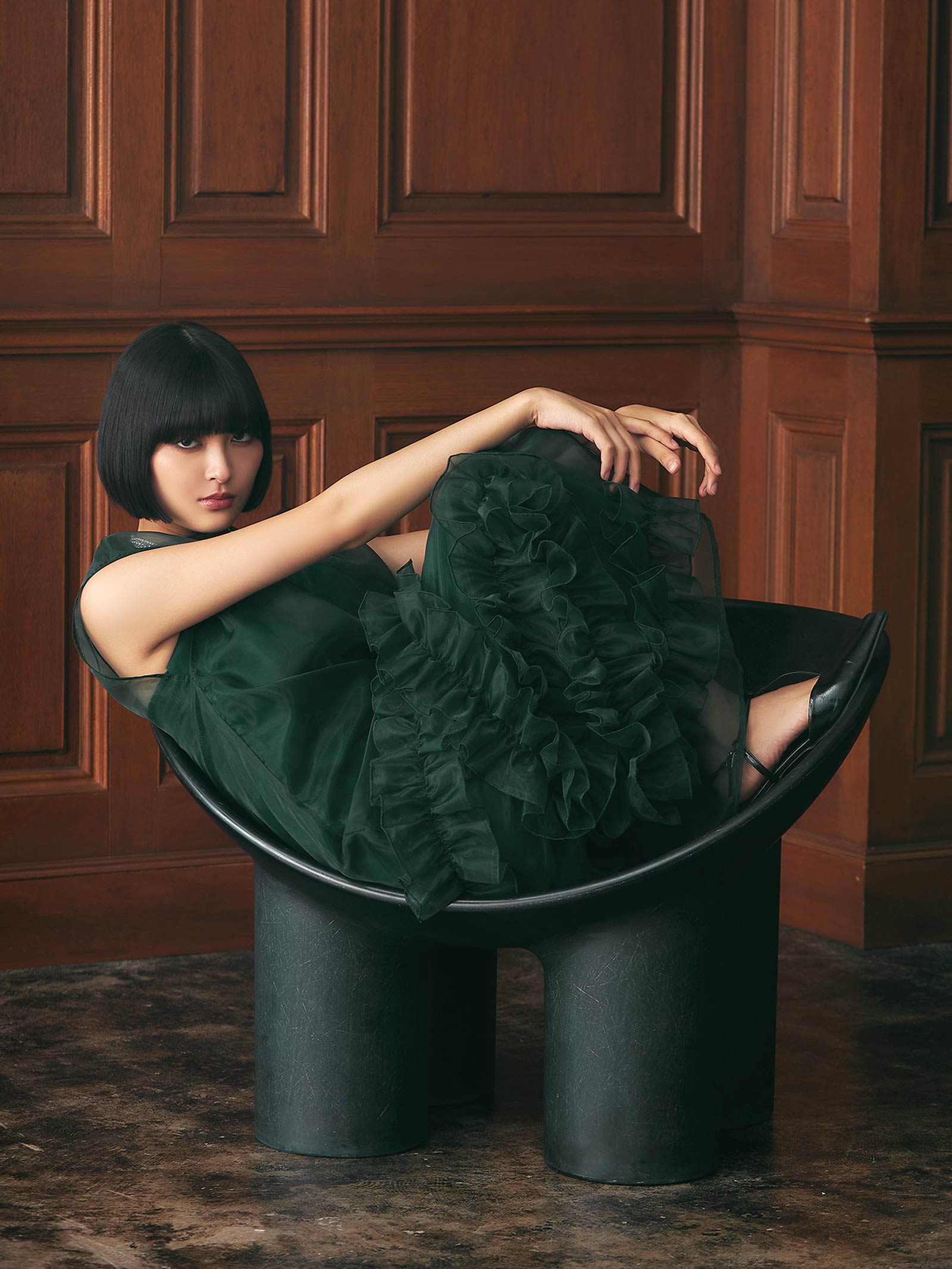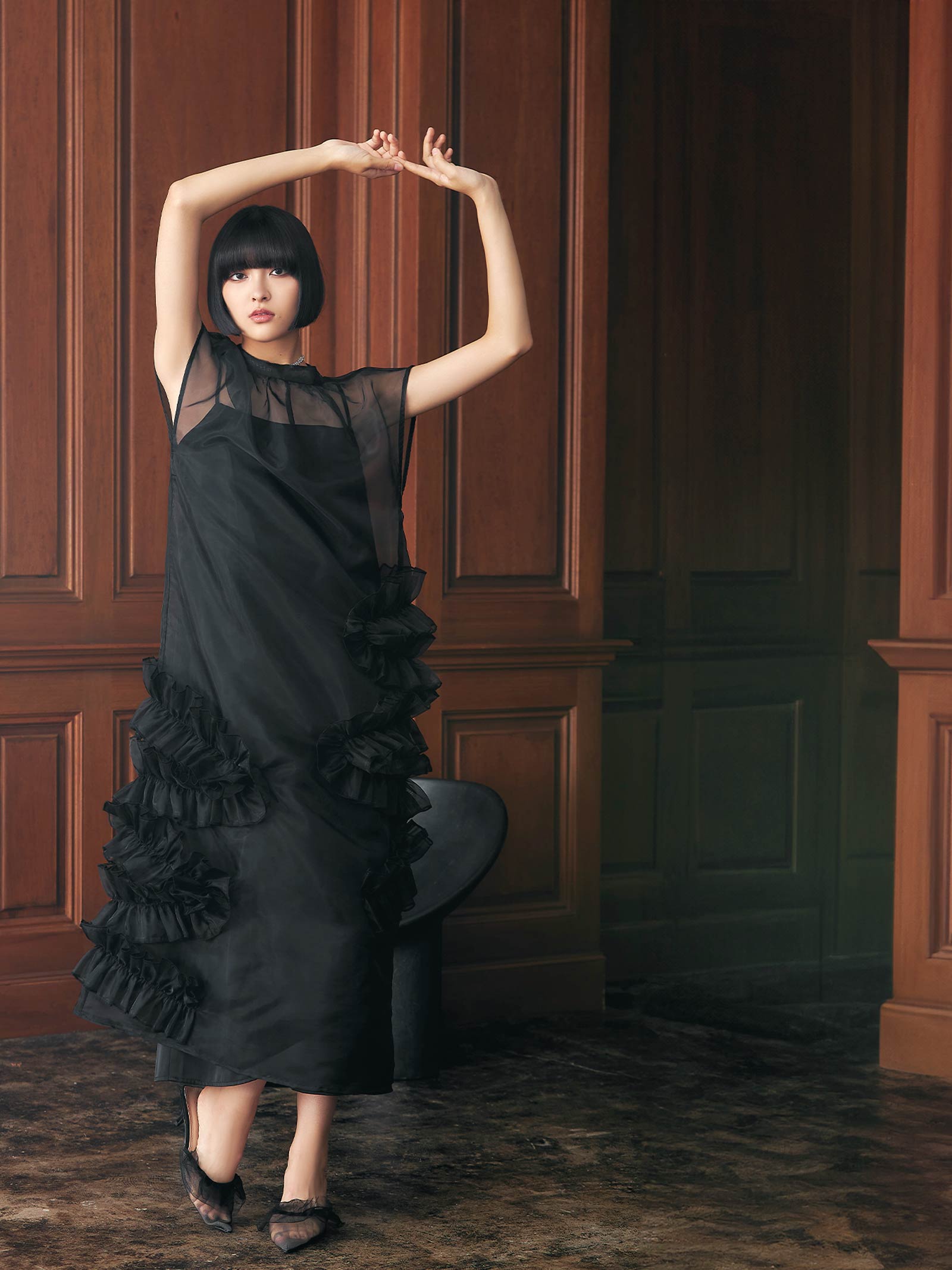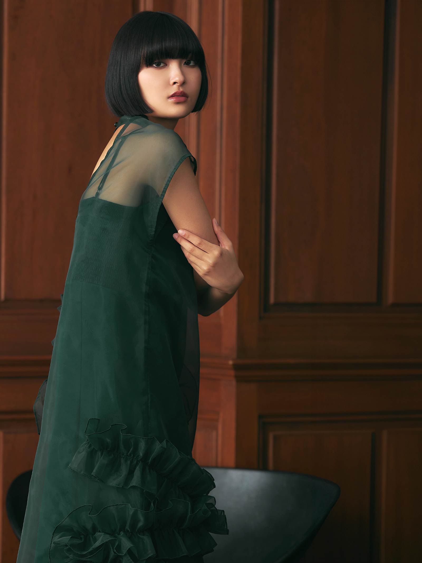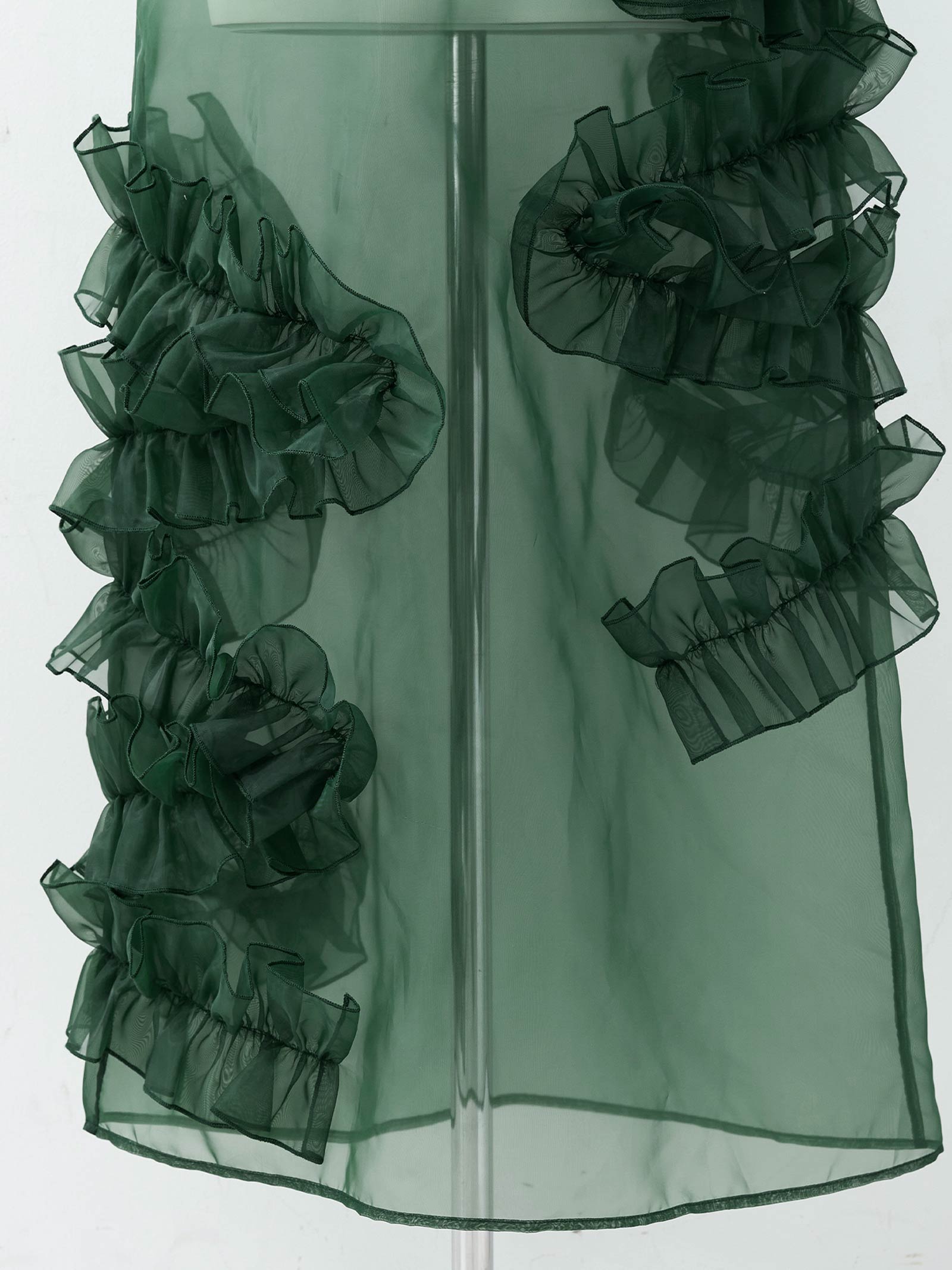 空気を含んで軽やかに広がるスカートは、ランダムにラッフルを配置しボリュームをもたせたデザインがポイントです。