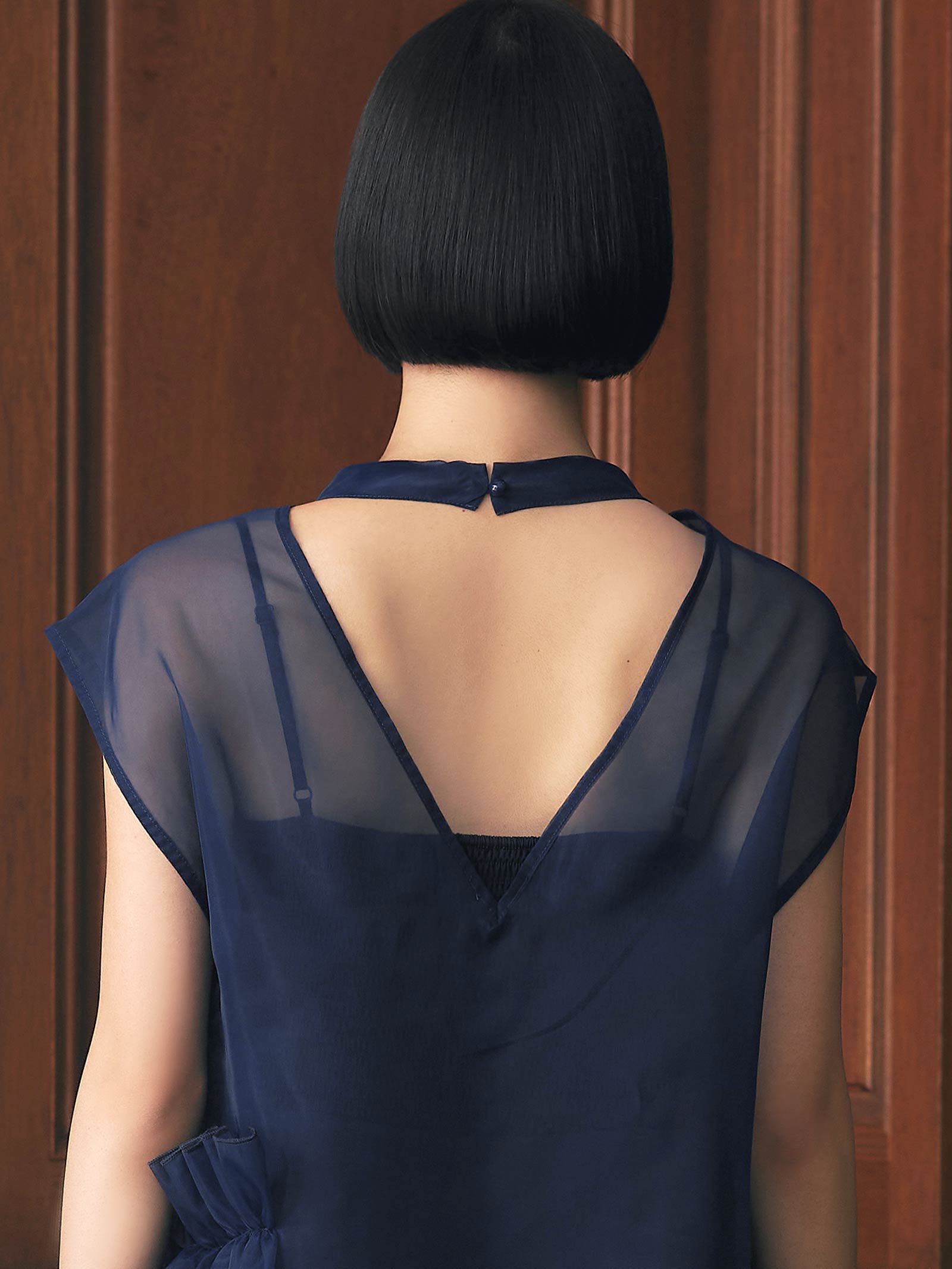 バックスタイルはVカットで仕上げ、着膨れ感のないスタイリッシュなデザインに。